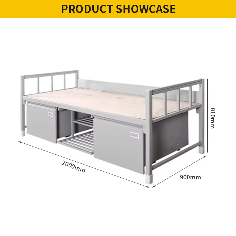 تساعد أدراج التخزين المدمجة أسفل السرير ورف الأحذية المركزي في تنظيم الأغراض الشخصية والأحذية، مما يُحسّن من استغلال المساحة ويحافظ على بيئة معيشية نظيفة. بفضل تصميمه العملي وسهولة صيانته وبنيته المتينة، يوفر هذا السرير حلاً عملياً وفعالاً للنوم في أماكن الإقامة التي تتطلب انضباطاً عالياً.